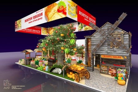 Главным объектом экспозиции, подготовленной Агентством инвестиционного развития Ростовской области, станет гигантское «Дерево продовольственного изобилия» с мощными корнями и раскидистой кроной, в которой созревают фрукты, овощи, арбузы, тыквы, колбасы, хлеб, сдоба и прочие продукты.